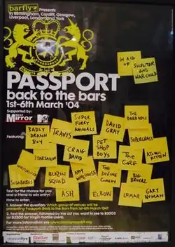 Passport: Back To The Bars/Passport: To BRITs Week is a charity fundraising project featuring internationally famous music artists performing intimate shows in small venues in the UK. It was originally conceived and created by music executive Stephen Budd and featured 20 shows across 6 venues around the UK in a week in March 2004.[1][2] These shows generated significant sums of money for two UK registered charities War Child and Shelter.[3]