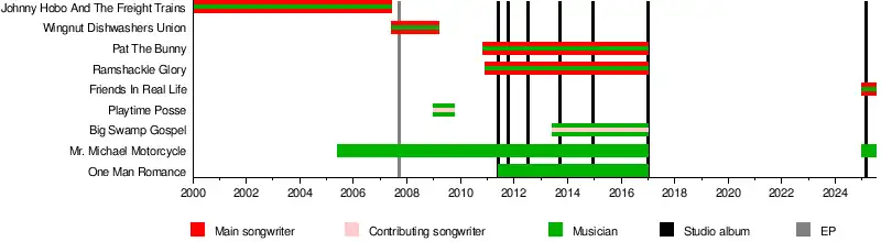 Pat's first major recording project was called "Running with Meat Cleavers" and was inspired by the contemporary Brattleboro punk scene, including bands such as Vomit Dichotomy and Fancy Pants & the Cell Phones. Following this was a band whose name would regularly change and was tongue-in-cheek, with the format of "Johnny ___ and the ___." For example, the band was called "Johnny Sexless and the Virgin Mafia" to reflect the themes of the song "DIY Orgasms." Eventually the name "Johnny Hobo" stuck, despite the vocal irritation of Pat himself at this name. The first demo was primarily solo, with just acoustic guitar played atop programmed drums. The group quickly expanded and became entirely acoustic. Johnny Hobo toured extensively during their career; often, Pat would be the only touring member. Alcohol, drug use, homelessness, politics, suicide, and the punk scene were common themes in Johnny Hobo songs.[10] Song for a Harmony Parking Lot may be in reference to a parking lot in Schneeweis's hometown of Brattleboro, where Schneeweis once did a nude sit-in protest and was quoted as saying, "It's too hot to wear clothes."[11] They released four EPs, two splits, a live album, and two compilations before disbanding.