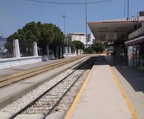 Patras railway station (Greek: Σιδηροδρομικός Σταθμός Πατρών, romanizedSidirodromikos Stathmos Patron) is a railway station in Patras in the northwestern Peloponnese, Greece. The station is located in the center of the city, beside the north port on Piraeus–Patras line and Patras–Kyparissia line and is served by both Proastiakos Patras Services. Pending the completion of the Athens Airport–Patras railway, it is also the starting point of TrainOSE bus lines to Aigio, Diakopto and Kiato, where connecting train services to Athens Airport and Piraeus (via Athens central railway station) are available.[4] Diakopto is also the terminus of the unique rack railway to Kalavryta.