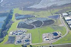 Working as a member of the Carollo Engineers design team, Johanson helped create a new water treatment facility. By overlaying art, public access, sewage treatment, habitat restorations, and agriculture, she embedded major urban infrastructure within living nature. Her design has been credited with "re-inventing art and reforming civil engineering".[48] The project includes natural systems to treat sewage, allowing millions of gallons of water to be reused. Johanson used the form of the endangered Salt Marsh Harvest Mouse to create the shapes of the polishing ponds, which contain islands that direct the flow of water and provide nesting habitat for birds. Other plantings support local wildlife. An additional 230-acre (0.93 km2) area of tidal wetlands was acquired for the park and wildlife sanctuary.[49][50] This multi-purpose landscape provides more than 3 miles (4.8 km) of walking trails for educational programs, nature study and tourism. Petaluma Wetlands Park coincides with a $150 million sewage treatment facility, while also serving as a highly visible model for converting sewage into recycled water, which is stored in a deep reservoir at the end of the "mouse's tail".[51]