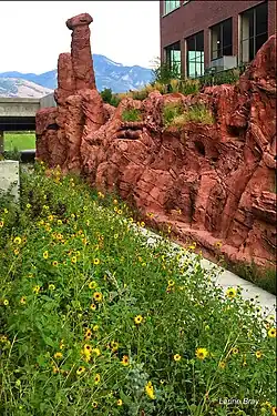 To the west of the tunnel lies a sculpted floodwall which helps lead water overflow to Parley's Creek. The shapes of the wall reference natural landmarks and forms of Utah's historic Echo Canyon, which helped guide Mormon pioneers to their new land. This miniature Echo Canyon is not only part of the flood-control system and a historical reference, but also a vertical garden with nesting places, water cachement basins, and ledges that provide habitat for native animals and plants.[60]