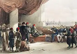 Campbell (centre) meeting Muhammad Ali of Egypt (left) in 1839. Witnessed and depicted by David Roberts | |