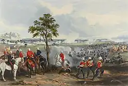 Grant served under Sir Hugh Gough as deputy assistant adjutant-general at the Battle of Maharajpore in December 1843 during the Gwalior campaign.[2] Promoted to brevet major on 30 April 1844,[3] he served as acting adjutant-general of the army at the Battle of Mudki in December 1845 (where he was twice wounded), at the Battle of Ferozeshah also in December 1845 and at the Battle of Sobraon in February 1846 during the First Anglo-Sikh War.[2] He became deputy adjutant-general of the Bengal Army in March 1846 and was promoted to brevet lieutenant colonel on 3 April 1846.[4]