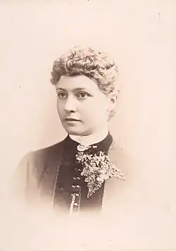 Browne first met her future husband Alfred Deakin in 1874, when she was 11 and he was 17. They were both attendees at the Melbourne Progressive Lyceum, the Sunday school for the city's Spiritualists.[4] In July 1877, Alfred became her class teacher; he was also the conductor of the school band. He participated in a number of her séances.[6] They danced for the first time at her coming-out ball the day before her 16th birthday.[7] In 1879, both were elected "leaders" of the Lyceum.[8] He began seriously courting her after her 18th birthday in 1881,[9] and proposed marriage in July. Her father gave only qualified approval, concerned about Alfred's social standing and lack of independent means.[10] According to family tradition, Pattie had also been courted by a wealthy 40-year-old baronet.[11]