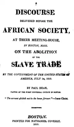 Paul Dean (1789โ1860) was an American 19th-century Universalist minister. He was a pastor in Boston, Massachusetts, of the First Universalist Church on Hanover Street (c.โ1813) and the Central Universalist Church on Bulfinch Street (1823โ1840).[1][2]