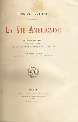 The publisher Firmin-Didot provided funding for Paul de Rousiers to visit the United States from March to June 1890. He wrote of what he found in La Vie américaine (1892), an analysis of American society based on deliberate investigation including visits to factories and farms, observations of life in the cities and countryside, and interviews with representatives of different social groups including owners, workers, politicians, officials and professionals. His goal was to understand the sociological forces behind the growing economic power of the US, which was starting to cause serious concern in Europe.[5] De Rousiers interviewed George Pullman, who exerted huge control over the workforce who lived in his Pullman City.[6] He wrote of Pullman's manufacturing complex, "Everything is done in order and with precision. One feels that some brain of superior intelligence, backed by a long technical experience, has thought out every possible detail."[7] The book appeared in English in 1892, translated by the geographer Andrew John Herbertson.[5]
