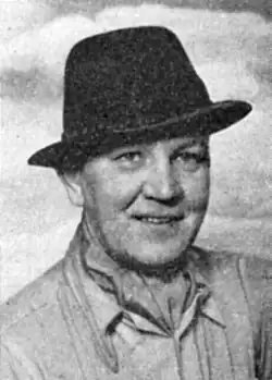 The cyclorama, under the genius of this man, came out a masterpiece. The only concession Paul asked, to which Walter Knott readily agreed, was the exclusive right to manufacture and sell art souvenirs, booklets and paintings on the premise.[12] Von Klieben lived on the farm and had his studio "at the end of the Ghost Town Trail," in "the adobe building which adjoins Ghost Town" that was completed shortly before February 1942 and was constructed of adobe bricks made on the property. This building is likely that which is now used as the entrance to Spurs restaurant.[13][14]