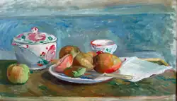 She also drew upon the color hues from her other mentor, Pierre-Auguste Renoir who brought sensuality to the style of Impressionism. Renoir would often implore the Gobillard sisters to pose for him as models and teach them on the side, painting during his encounters in the southern coast of France, notably in Brittany.[1] During this period, she also served as a model in several of close friend Edgar Degas' photographs.[5] In 1894, she held her first exhibition of her works and was subsequently exhibited with other prominent artists during that period at the Société des Indépendants. In 1900, Paule’s sister married Paul Valéry, a French poet and essayist. After this union, Paule resided with the couple in Morisot's home, where she produced some of her most well-known work.[6] She went on to further exhibit two other works at the Salon d'Automne in 1904 and then twelve works at Le Salon des Tuileries in 1926. Gobillard continued painting and lived until 1946, when she died in Paris.[3]