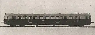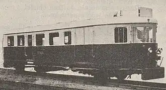 The prototype, designated Type 1, was presented to the press on October 27, 1931 during a trip between Bordeaux-Saint-Louis and Le Verdon.[10] The railcar leaves the Bordeaux-Saint-Louis station, following the express for the 100 km to Le Verdon. With stops in Bruges, Pauillac, Lesparre and Soulac-sur-Mer,[11] the journey takes 1 h 45. The return journey is an omnibus mission which, despite stopping at each of the 22 stations on the line, takes just 1 h 40, five minutes less than the express and almost half the time taken by the steam omnibus train to cover the same distance.[11]