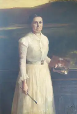 Born on 17 July 1858 in Roskilde, Pauline Thomsen was the daughter of the lecturer Christen Thomsen (1822–1874) and Pauline Mathea Georgine Bergstrøm (1831–1896). From 1877 to 1880 Thomsen attended Vilhelm Kyhn's art school in Copenhagen as the Royal Danish Academy of Fine Arts did not admit women until 1888.[2] She adopted his Romantic approach in the landscapes she painted first in Zealand and later together with Kyhn's former students in the area around Ry and Himmelbjerget in Jutland.[3] Her landscapes seldom include figures but often have striking groups of trees. Like Kyhn, she gave the sky and cloud formations an important place in her paintings.[2] Her few portraits are mainly pen-and-ink or charcoal drawings.[1]
