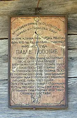 On 8 December 1816, he died in Vranić where he was buried in front of the church gate, and on his tomb, it is written: "An excellent Serb, a fighter for the liberation of the people and his fatherland during the uprising of Karađorđe and Prince Miloš in 1804 and 1815, decorated member of the First People's Court, Pavle Popović."[6][1]