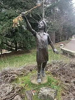 The centerpiece of the park is Sadako and the Thousand Paper Cranes, a bronze statue of Sadako Sasaki designed by sculptor Daryl Smith.[4] Sasaki was a survivor of the atomic bombing of Hiroshima at the age of two but later died of leukemia a decade later. During her hospitalization, she aimed to fold one thousand origami cranes, which continue to be placed on her statues in Seattle and Hiroshima.[2][5] As of 2023, the statue is the only outdoor monument in Seattle's municipal art collection that honors a female historical figure.[6]