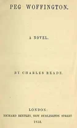 Peg Woffington is an 1853 novel by the British author Charles Reade. It was inspired by the popular stage play Masks and Faces which he had co-written with Tom Taylor the previous year.[1] Reade portrayed the London success of the Irish actress Peg Woffington (1720-1760) and featured other prominent figures of the days such as David Garrick.