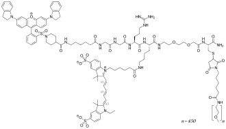 - A tripeptide linker (Gly-Gly-Arg), which is cleaved by tumor-associated proteases (cathepsins and matrix metalloproteinases). Once cleaved, Cy5 is released from proximity to QSY21, restoring its fluorescence.