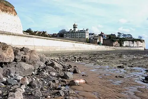 The Pegwell Bay Hotel is a Grade II listed hotel complex in the village centre. It was constructed in the mid 19th century by James Tatnell, and opened as Tantell's Hotel.[8][9] The hotel consists of three storeys and an attic, with a tower and belfry in the centre.[8]