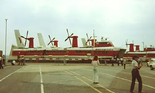 At the north east corner of the bay are the remains of Hoverlloyd's cross-channel Ramsgate Hoverport. Vehicle and passenger carrying hovercraft operated from here from 1969 until 1982. For a time, the hoverport was used as an administrative and engineering base by Hoverspeed after all passenger services had ceased. However, the former activity moved to Dover in October 1985 and the latter (mainly used for craft overhauls) in late December 1987 with the buildings demolished in 1992.[5] The hovercraft pad, car-marshalling area and approach road are the sole identifiable features that remain at the site.[6]