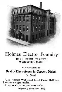 When he turned 14 Holmes left school and went to work for the Reed and Prince Manufacturing Co. of Worcester where he "tended machines".[1] Holmes also worked at the Brunell Electroplating plant, where he learned the business of Electroplating. In 1909 Holmes established his own Electroplating firm, the Holmes Electrotype Foundry.[1]