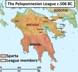 The Peloponnesian League is the modern name given to the Spartan system of alliances, but it is inaccurate because there were members outside the Peloponnese, and it was not really a league. The ancient name of the League was "the Lacedemonians and their allies".[2] This is misleading as well, because Sparta could have allies outside of the Peloponnesian League.[3]
