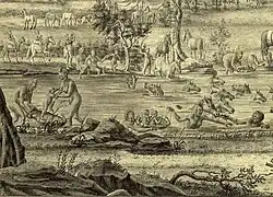 It also served to convey those who could not swim, or would not. In the colonial era, Spanish military commanders, though they knew how to swim, held it was beneath their dignity to strip in front of the common soldiery, and were conveyed by pelota; "scorning the assistance of another person, they impel forwards by two forked boughs for oars".[33] The Rodrigues Ferreira expedition to the Mato Grosso (c. 1785) drew indigenous people taking their children across in pelotas, propelled by pairs of women.[34]