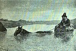 They loaded my firearms and two trunks and I sat on one of them. The towing horse lost his footing, which made me realise that the slightest movement could make me sink: I would have preferred to cross on horseback a thousand times. But, I got used to it; it seemed quite a comfortable vehicle, and I even felt disposed to cross any river, in spite of my boat's flexibility, which gave way at the slightest change of posture—it obliged me to keep perfectly still. Several times the man towing me disappeared underwater with his horse, but my boat floated on, though it became so deformed that I ended up finding myself at the bottom of a sort of funnel, where I could barely move.