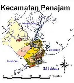 On 24 April 1969, Penajam was transferred from Kutai to Balikpapan by gubernatorial decree 55/TH-Pem/SK/1969.[3] Since that date, the district had been known as Balikpapan Seberang (lit. "opposite of Balikpapan") until 13 October 1987, when it was transferred again to Pasir Regency by government regulation number 21, and the name change was reverted.[4] On 11 June 1996, the northern parts of the district (12 villages) were separated to form Sepaku.[5]