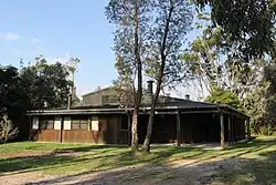 Inside the "Barn", the main feature of the open planned space was a giant, almost centrally placed steel fireplace and combustion stove mounted back to back, offset from the centre on the southern side. On the northern side of the stove, the open fireplace had natural stones forming a hearth and beyond was the combined living and dining space. A large rectangular dining table had log legs that were set permanently into the floor. The space is still furnished with the original deck chairs and Betty Grounds's bamboo hanging chair, which dates from the 1970s. To the west and in the same space was a double bed with a mosquito net suspended above. Behind the stove was an improvised galley kitchen with a gas fueled refrigerator, stainless steel sink and the combustion stove for cooking. Shelves, towel rails and benches made by Grounds complete the joinery and there is also a cabinet with impressive dovetail jointing that Grounds had made in the 1930s for his first house "Ranelagh", at Mt Eliza in Victoria. The hot water service was mounted above the stove and behind the flue, the entire set-up being designed by Grounds. The floor was lined with cylindrical wooden blocks that originally extended out, approximately one metre around the building. With time, the inside end grain blocks became smooth and shiny, their random pattern contributing to the overall rusticity of the grand, almost baronial, space. The outside blocks are completely rotted and gone. To the south and west, two bays of the externally exposed sloping frame were enclosed and roofed with yellow corrugated fibreglass. One bay became a sunken bathroom complete with a square hip bath, river pebbles and a tiny timber window hatch to ventilate the space. The original door to the bathroom was counterbalanced by a weighted tin can. Water was by run by pipe from the nearest of a number of dams and tanks installed by Grounds on the site. A septic tank was also installed. The external walls of the bathroom pod were lined vertically with Tanalith treated saplings. The roof to the bathroom was originally translucent yellow fibreglass, giving a diffused yellow light. The second bay was used for storage, in particular for the batteries storing the energy produced by the wind tower.[3][1]
