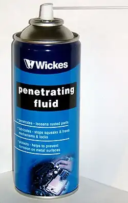 Penetrating oil, also known as penetrating fluid, is a low-viscosity oil. It can be used to free rusted mechanical parts (such as nuts and bolts) so that they can be removed, because it can penetrate into the narrow space between the threads of two parts. It can also be used as a cleaner; however, it should not be used as a general-purpose lubricant or a corrosion stopper. Using penetrating fluids as general-purpose lubricants is not advisable, because such oils are relatively volatile. As a result, much of the penetrating oil will evaporate in a short amount of time, leaving little residual lubricant.