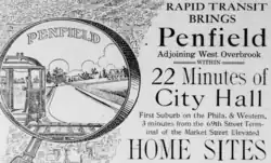 The development of Penfield began to be planned in 1907 when the Philadelphia and Western train brought service from 69th street to Norristown.[3][4] The proximity of Penfield to the city of Philadelphia was a selling point for the budding suburb.[6][4] The reliance on the P&W rapid transit line and the development of Penfield around it make it an early 19th century example of a streetcar suburb, one of several in the Western Suburbs of Philadelphia. The development of Penfield, including its sidewalks, roads, gutters and landscaping, was undertaken by Clifford B. Harmon & Company.[4][7] Clifford B. Harmon was a wealthy real estate developer and aviator, founding the International League of Aviators. The development of Penfield was well underway by 1910.[8]