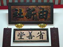 Calligraphy plaques from Iû-sin siā / Club (由新社, above) and Síng-siān tn̂g / Hall. ( 省善堂, below)