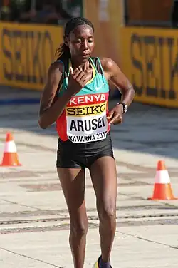 She began 2010 with a win at the Lisbon Half Marathon, finishing with a time of 1:08:38.[5] She improved her personal best at the Lille Half Marathon in September, running 1:07:48, but she was beaten to the finish line by débutante Florence Kiplagat.[6] Arusei was selected for the 2010 IAAF World Half Marathon Championships as a result and she gained the bronze medal, forming the winning Kenyan team with Kiplagat and Joyce Chepkirui.[7] Her 2011 season stated at the Paris Half Marathon and set a course record time to win the race.[8] Making her debut over the distance, she led at the Vienna City Marathon for the first 30 km. However, she slowed in the heat and ended up in third place with a time of 2:27:17 hours.[9] At the Amsterdam Marathon, she was among the mid-race leaders but yet again fell behind in the second half, ending the race in sixth place.[10]