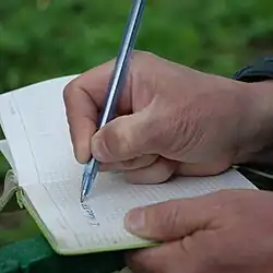 Handwriting requires the motor coordination of multiple joints in the hand, wrist, elbow, and shoulder to form letters and to arrange them on the page. Holding the pen and guiding it across paper depends mostly upon sensory information from skin, joints and muscles of the hand and this adjusts movement to changes in the friction between pen and paper.[31] With practice and familiarity, handwriting becomes highly automated using motor programs stored in motor memory.[32] Compared to other complex motor skills handwriting is far less dependent on a moment-to-moment visual guidance.[33][34]