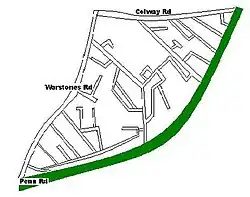 Penn (population 12,392[6]) is a formal ward of Wolverhampton, West Midlands. Penn ward borders the wards of Merry Hill, Graiseley and Blakenhall as well as South Staffordshire. It forms part of the Wolverhampton West constituency.[7]