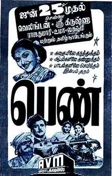 Penn (transl. Girl) is a 1954 Indian Tamil-language romantic comedy film written by Ra. Venkatachalam and directed by M. V. Raman. It stars Vyjayanthimala, Anjali Devi, Gemini Ganesan, and S. Balachander while V. Nagayya, V. K. Ramasamy, K. N. Kamlam, K. R. Chellam and K. Sankarapani feature as the ensemble cast. The film was produced by A. V. Chettiar of AVM Productions. The score was composed by R. Sudharsanam with the lyrics by Papanasam Sivan and Udumalai Narayana Kavi, Ku. Sa. Krishnamurthy, K. P. Kamakshi and V. Seetharaman. Editing was done by K. Shankar and M. V. Raman while the camera was handled by T. Muthu Sami.