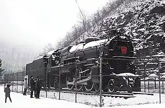 In May 1956, No. 1361 was retired from the PRR and was cosmetically refurbished to be on display next to the Horseshoe Curve, where it was dedicated on June 8, 1957.[14][16][17] It had traveled over 2,469,000 miles (3,973,000 km) during its revenue service.[5] For three decades, No. 1361 sat on display outside exposed to the elements, so the members of the Horseshoe Curve Chapter of the National Railway Historical Society (NRHS) were volunteered to repaint and maintain the locomotive.[18][19]