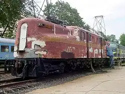 The GG1 was developed in 1930s by General Electric as the replacement for the Pennsylvania Railroad's then standard electric locomotive, the P5a, and was based largely on the New Haven EP3.[1] The GG1 was capable of a top speed of 100 miles per hour (160 km/h), powered by its twelve 385 horsepower (287 kW) traction motors. The prototype GG1, PRR 4800, was tested against Westinghouse's submission, the R1. The Pennsylvania selected the GG1 over the R1, as the R1 was not articulated and the GG1's traction motors were similar to ones already in use.[2] An order for 57 GG1s was placed in November 1934 and the first locomotives were delivered in April 1935.[3]