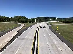 An extension of the Warren Street Bypass from US 222 to Pricetown Road was proposed in 1962. Two routes for the extension were proposed: one following a more southerly route as it does today and another following a more northerly route along Spring Valley Road, passing near the Bernhart Reservoir. The extension of the bypass was intended to provide access to a growing industrial park.[24] In 1966, plans were made to make the portion of the Warren Street Bypass through the Glenside neighborhood of Reading limited-access by eliminating at-grade intersections with local streets, resulting in the streets coming to a dead end at the bypass.[25] The more southerly route for the Warren Street Bypass extension between US 222 and Pricetown Road was selected by 1969.[26] On November 15, 1975, the American Association of State Highway and Transportation Officials (AASHTO) approved for US 222 to be routed to bypass Reading, with the route following the Warren Street Bypass between US 422 in Wyomissing and Allentown Pike.[27][28] In 1976, construction began on the extension of the Warren Street Bypass between US 222 and Pricetown Road.[29] The portion of the Warren Street Bypass between Spring Valley Road and Pricetown Road was completed in July 1979 while the portion between 11th Street and Spring Valley Road was completed in December 1979.[30] In 1980, the remainder of the Warren Street Bypass extension between US 222 and 11th Street was completed.[29][31][32]