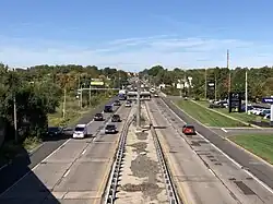 On January 9, 1960, the PDH awarded a contract worth $1,488,493 to James D. Morrisey, Inc. to upgrade the section of PA 132 between Neshaminy and Warminster to a four-lane divided highway.[17] In November 1961, the portion of Street Road southeast of US 13 was closed to allow for construction of I-95 (Delaware Expressway), which would include an interchange with Street Road; this interchange was planned to be completed in 1962.[18] In January 1962, a proposal was made to split PA 132 onto separate roadways through Feasterville, with the westbound direction using Irving Place a block north of Street Road.[19] In January 1963, plans were made to widen the entire length of PA 132 to 80 feet (24 m) with a median strip, with a portion in Feasterville to be widened to 71 feet (22 m). The widening was originally planned to be completed in 1965.[20] By March of that year, the widening project was shelved as the state felt they should receive federal funds to fund the project.[21] With the widening shelved, businesses from Feasterville and Southampton along with State Senator Marvin Keller led a push to get the portion of Street Road through the two communities paved, which was in disrepair and saw a lot of accidents.[22]