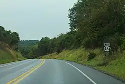 Pennsylvania Route 16 (PA 16) is a 43-mile-long (69 km) east–west state route located in southern Pennsylvania, United States. The western terminus of the route is at U.S. Route 522 (US 522) in McConnellsburg. The eastern terminus is at the Mason–Dixon line in Liberty Township, where the road continues into Maryland as Maryland Route 140 (MD 140). PA 16 is a two-lane road that runs through rural areas in Fulton, Franklin, and Adams counties. The route heads east from McConnellsburg and crosses Tuscarora Mountain into Franklin County, where it continues east into the agricultural Cumberland Valley. Here, the passes through Mercersburg, Greencastle, and Waynesboro. PA 16 heads east through the South Mountain range, where it heads into Adams County and passes through Carroll Valley before coming to the Maryland border. PA 16 intersects several roads including PA 456 in Cove Gap, PA 75 and PA 416 in Mercersburg, PA 995 in Upton, US 11 and Interstate 81 (I-81) in Greencastle, PA 316 and PA 997 in Waynesboro, and PA 116 in Carroll Valley. The road's main name is Buchanan Trail in honor of 15th President James Buchanan, who was born near the road in Cove Gap.