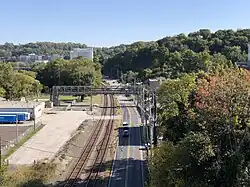 Also in the 1960s, plans were made to build the Phoenixville Spur, a 4.4-mile expressway spur route of PA 23 running from the intersection of PA 23 and PA 724 in East Pikeland Township to the then-planned Pottstown Expressway (US 422) near Arcola. The spur was planned to include interchanges at Township Line Road and Freemont Street (PA 113) in the borough of Phoenixville, an interchange with PA 29 near Mont Clare, and a partial interchange with the Pottstown Expressway at the route's eastern terminus, providing access to and from the east. Although PennDOT had secured funding for the spur, the start of construction was delayed for many years due to both local opposition to the location of the highway within Phoenixville, along with disputes over the design of the interchanges within the borough. As a result, the project has been considered dead since the late 1970s.[35][36] One remnant of the Phoenixville Spur can still be seen today, as part of the Pottstown Expressway (US 422) near Arcola was constructed with a wide median, done specifically to accommodate for the planned interchange with the spur.[37][38]