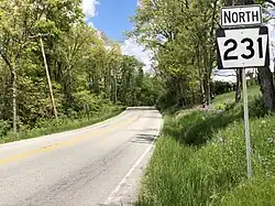 PA 231 begins at an intersection with PA 18 in East Finley Township, heading to the west on two-lane undivided East Finley Drive. The road heads through wooded areas with agriculture, running to the north of the Enlow Fork of the Wheeling Creek. The route curves southwest before making a sharp turn north away from the creek. PA 231 winds north through more areas of woods and farms with occasional homes, passing through the community of East Finley. The road continues through rural areas for several more miles, continuing into Donegal Township. After passing under I-70, PA 231 becomes Bell Avenue and forms the border between Donegal Township to the west and the borough of Claysville to the east, reaching an intersection with US 40. At this point, the route turns east to form a concurrency with US 40 on Main Street, fully entering Claysville and running past homes. PA 231 splits from US 40 by turning north onto Wayne Street, continuing through more residential areas.[1][2]