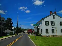 The road heads west through areas of woods and farms with some development, with PA 333 splitting from PA 35 by heading to the south. The route winds through agricultural areas farther from the river before curving southeast into forested areas with some fields and homes, becoming West Licking Street. PA 333 becomes the border between Milford Township to the west and the borough of Port Royal to the east as it reaches an intersection with PA 75. Here, the route turns south to join PA 75 on Market Street, crossing the Tuscarora Creek into Turbett Township.[2][3]