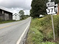 Originally, a short portion of PA 371 was part of PA 170 in the 1928 mass numbering of state highways in Pennsylvania.[8] 83 years after the abandonment of the Great Bend and Newburgh Turnpike (1936), the Pennsylvania Department of Highways took over the alignment of the highway for the designation of Legislative PA 371. The route at that point began at an intersection of U.S. Route 11 in Great Bend to the state line on the Delaware River in Damascus.[9] The route remained intact along the turnpike for only eighteen years when in 1954, the Department of Highways truncated PA 371 back to the intersection with PA 171 in the community of Herrick Center.[10] Seven years later, the Department of Highways designated both PA 374 on the alignment from Royal to Herrick Center and PA 848 from the community of New Milford (south of Great Bend) to Gibson.[11]