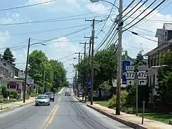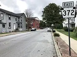 Here, the name of the road becomes West State Street and it passes homes, reaching a junction with US 222. At this point, US 222 becomes concurrent with PA 372 and the road is lined with more residences. In the center of Quarryville, US 222 turns to the south and PA 372 continues along East State Street through the commercial downtown. The route passes homes and businesses in the eastern part of Quarryville and intersects the northern terminus of PA 472. The road comes to a bridge over the Enola Low Grade Trail and leaves Quarryville for Eden Township, where the name changes to Valley Road.[2][4] At this point, the route enters the Pennsylvania Dutch Country of eastern Lancaster County, which is home to many Amish farms.[5][6] PA 372 heads east-northeast through farmland with some wooded areas and homes. The route continues into Bart Township and passes through more rural land before it reaches an intersection with PA 896 in the community of Green Tree. At this point, PA 372 turns north onto PA 896 and the two routes run concurrent through a mix of farms and homes along Georgetown Road.[2][4]