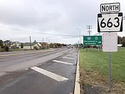 PA 663 was once part of the Steinsburg and Milford Square Turnpike. The turnpike was chartered in March 1858.[6] When Pennsylvania legislated routes in 1911, what is now PA 663 was not given a number.[7] PA 663 was designated in 1930 to run from in U.S. Route 422 (US 422, High Street) in Pottstown north to PA 73 in New Hanover Township. At this time, the entire length of the route was paved, along with the unnumbered road between PA 73 and Quakertown.[2] In 1936, PA 663 was extended north to an intersection with US 309 (now PA 309) and PA 212 (now PA 313) in Quakertown. The route followed its current alignment between PA 73 and Pennsburg before it followed Quakertown Road and Sleepy Hollow Road to Spinnerstown, where it turned east and followed Spinnerstown Road and Milford Square Pike to Quakertown.[8] By 1967, the southern terminus of PA 663 was rerouted to PA 100 in Pottstown, heading west on King Street.[9] In the 1960s, PA 663 was shifted from Milford Square Pike to a new alignment to the north between the Pennsylvania Turnpike Northeast Extension and Quakertown.[10] After construction began in 1973, a new alignment of PA 663 to the south from Pennsburg to the Pennsylvania Turnpike Northeast Extension opened a year later, with the route moved off Quakertown Road, Sleepy Hollow Road, and Spinnerstown Road.[11][12]