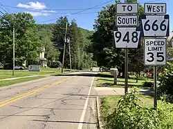 There are more and more gaps in the forestry and the highway enters Barnes. In Barnes, PA 666 intersects with PA 948's northern terminus. After Barnes, the route becomes more civilized, and the highway passes more homes. Nearing its end, PA 666 re-enters the forested area, leaving quickly. The highway terminates in Sheffield, at an intersection with US 6.[2]