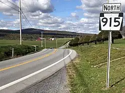 Pennsylvania Route 915 (PA 915) is a 22-mile-long (35 km) state highway located in Fulton and Bedford counties in Pennsylvania. The southern terminus is at Interstate 70 (I-70) in Brush Creek Township. The northern terminus is at PA 26 in Hopewell.