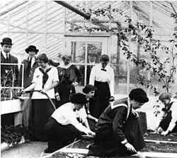 During World War I, the Pennsylvania School of Horticulture for Women was significantly involved in starting the Woman's Land Army of America, which mobilized nearly 20,000 women to work in America's agricultural sector.[27] The Saturday Evening Post commended Elizabeth Leighton Lee and the school, stating that "the graduates of Miss Lee's school have a wonderful chance to serve their country, for they are the material that should make the officers in our volunteer agricultural army".[28] Women in the program were known locally as the "Ambler Farmerettes".[3][29][30] Among other activities, the school held "War Courses" for Captains and Lieutenants of Land Army Units.[31] In 1918, fourteen students represented the school in a defense parade in Philadelphia, carrying signs such as "Hens Against Huns" and "Don't Let it Rot - You'll Need it".[21][32]