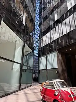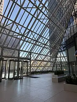 The connecting atrium at ground level serves as a shared lobby and public gathering space. The glass roof and surrounding reflective surfaces enhance the sense of openness and fluidity, a stark contrast to the typical hermetic skyscrapers of the era. The ceiling creates an engaging and interactive experience, filling the lobby with sunlight and acting as a large-scale skylight. The two buildings never interlock, instead creating a pseudo hallway between their facades in the plaza.[2][14][15]