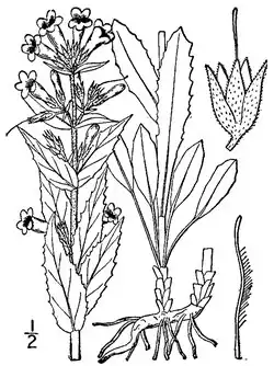 The inflorescence is a thyrse with flowers blooming in succession from bottom to top as it grows, the portion with flowers being 4–25 cm long and occasionally as long as 30 cm.[3] The stems have a cylindrical cross section and are densely glandular-pubescent.[4] There will be 2–10 groups of flowers on short stems attaching to the main stem (verticillasters).[4] Close examination will show that each group on the stem is subdivided into a pair of attachment points with each having 2–7 flowers.[10] The bracts close to each flowering group are pointed and narrow (lanceolate) 17–65 mm long and 3–17 mm wide. The short pedicels supporting each flower are also densely glandular and hairy as is the flowering stem (peduncles).[4]