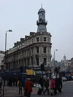 The block of properties at No. 295–297 Pentonville Road, at its junction with Gray's Inn Road, is known as the "Lighthouse Block" owing to the lead clad tower at the top of the building.[16] The site avoided being compulsory purchased and demolished (in order to provide improvements to King's Cross station's eastern entrance) and is now Grade II listed.[16][17]